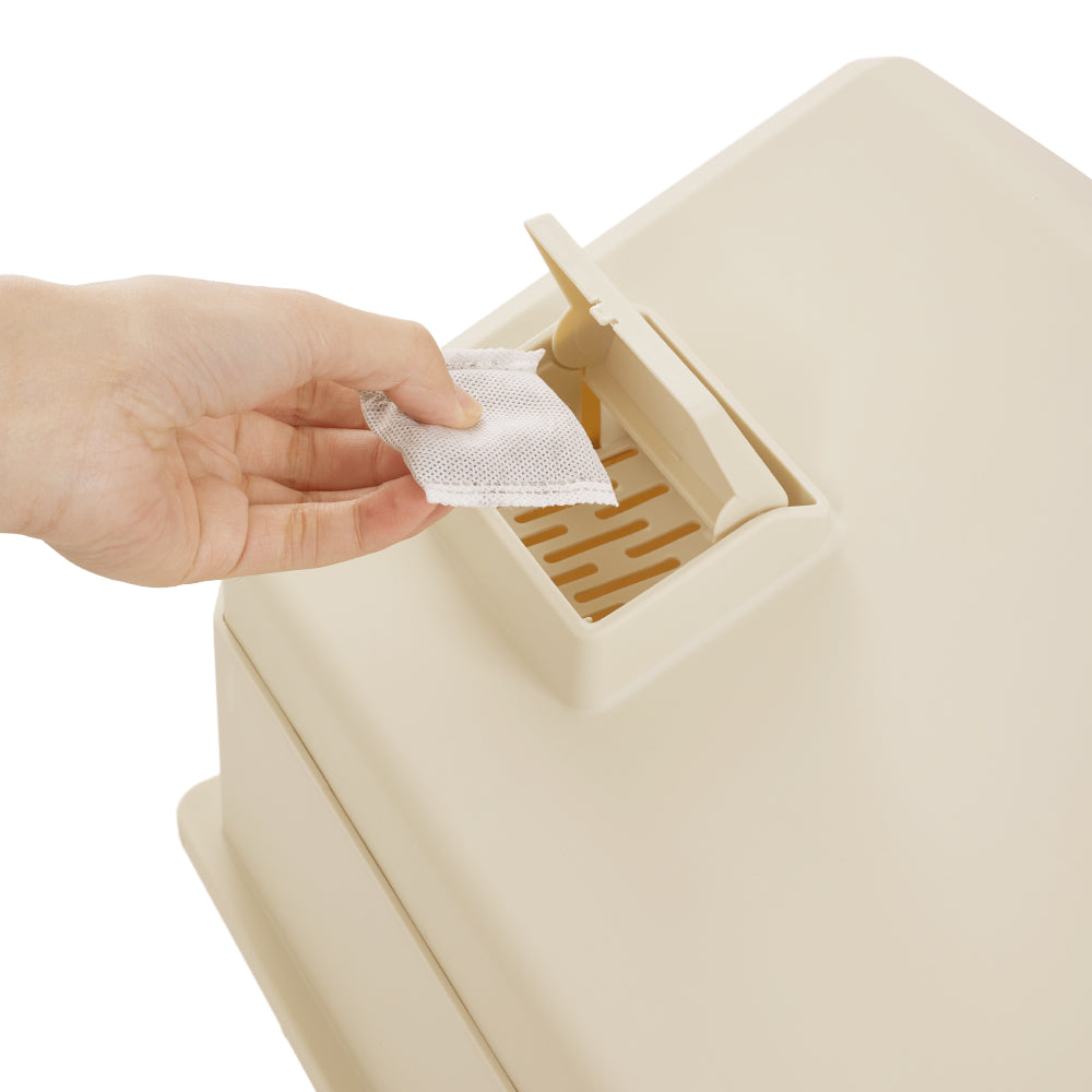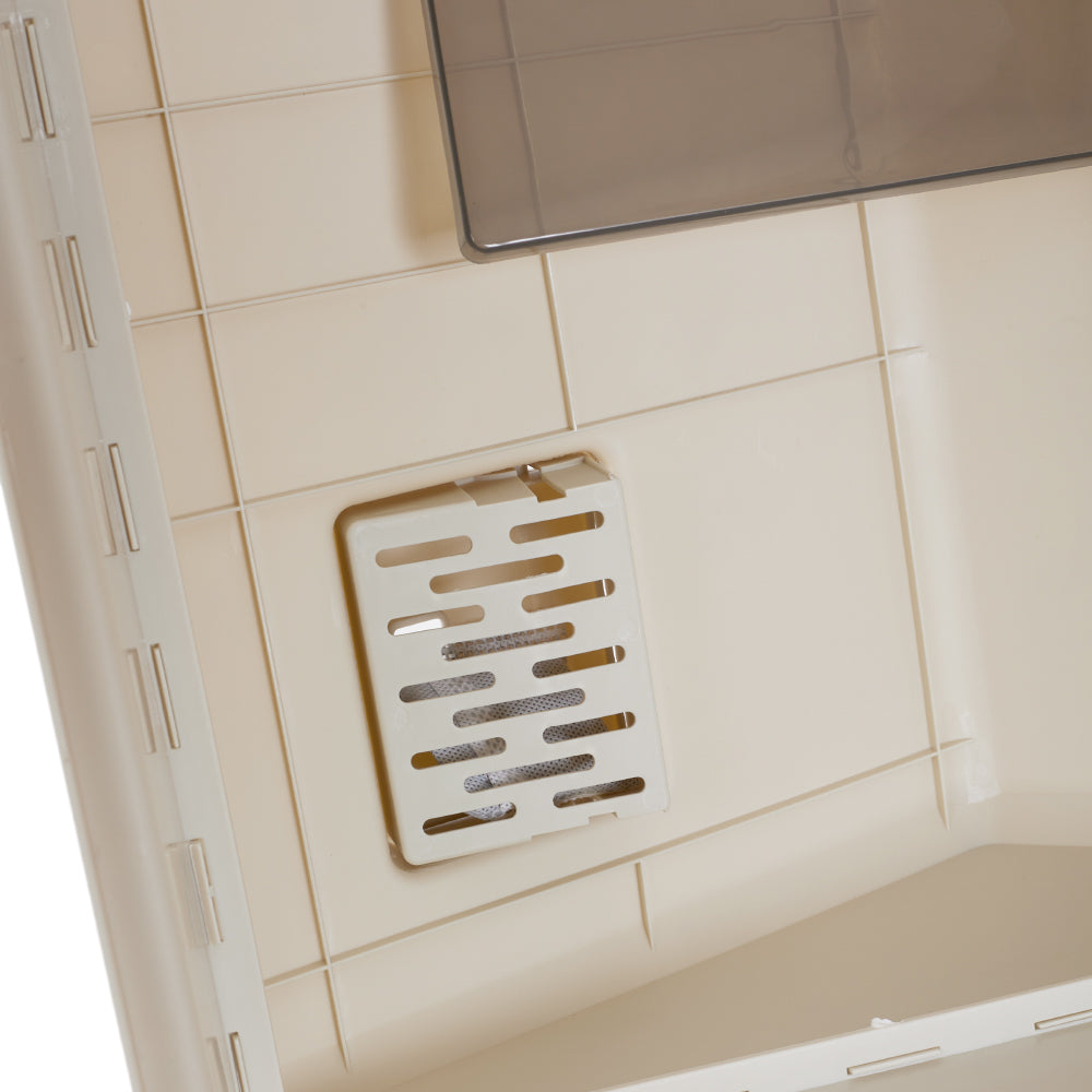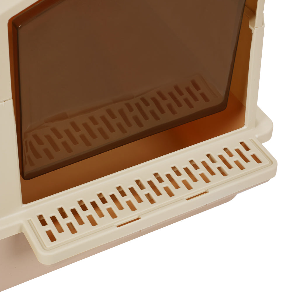 Description: Bring comfort and cleanliness to your cat’s daily routine with this charming hut-style litter box from Tieker. Designed for cats of all sizes, including multi-cat households, its spacious enclosed interior offers privacy and odour control. The integrated deodorizing compartment holds an activated charcoal bag to neutralise smells, while the front pedal helps trap stray litter from your cat’s paws. The flip-top lid allows for quick litter replacement, and the two-way door offers easy entry and exit for your pet. Made from durable, easy-to-clean PP material, this litter box also folds down for compact storage—making it a smart and stylish choice for any cat owner.