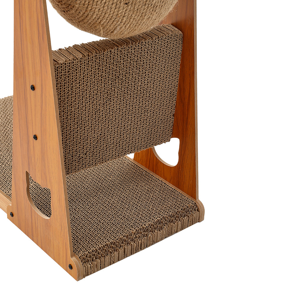 Crafted from durable corrugated board and smooth-edged high-density wood, it offers a safe and sturdy experience for everyday use. The built-in sisal ball adds an element of interactive fun, encouraging healthy play and helping redirect scratching behavior away from your furniture. Perfect for indoor environments, this modern piece blends seamlessly into your home while creating a dedicated enrichment zone for your cat.
