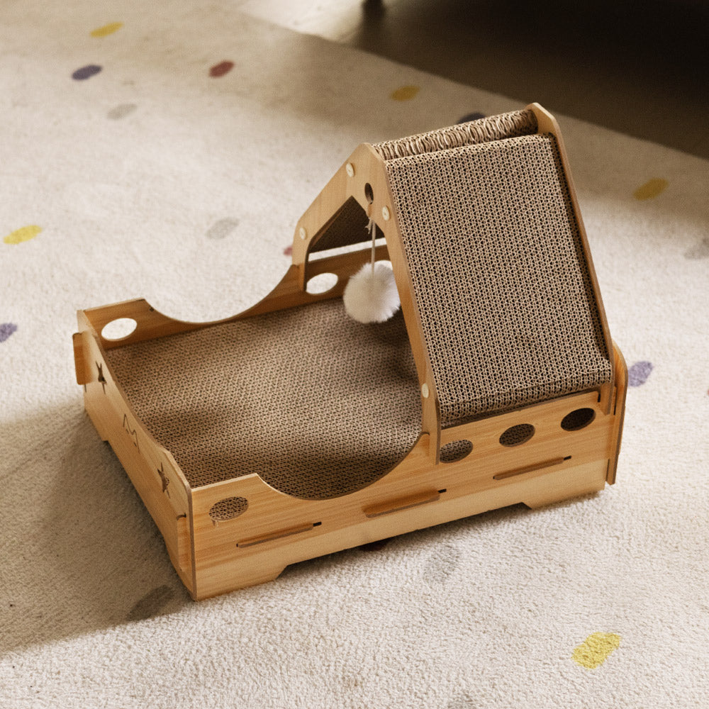 Tieker's Multi-Functional Cat Scratching Board offers the perfect blend of entertainment and comfort for your feline friend. Crafted from high-quality, corrugated cardboard, this durable scratching surface is designed to satisfy your cat’s natural instinct to scratch, helping to preserve your furniture from damage. The charming house design provides a cozy retreat where your cat can rest and feel secure. Featuring a fluffy toy ball that dangles enticingly from within, it invites playful interaction, keeping your pet engaged and active. With its simple yet elegant light wood tone, this scratching board easily complements any home decor, making it a stylish and functional addition to your space. It’s more than just a scratching post—it's a complete playhouse for your pet’s well-being!